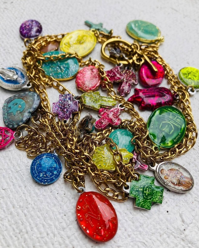 ✨ Les bijoux d’Iza.K, d’inspiration bohème, lumineux et colorés, faits de pierres fines, perles d’eau, fils noués, et tissés de breloques recyclées ou incluses dans la résine.