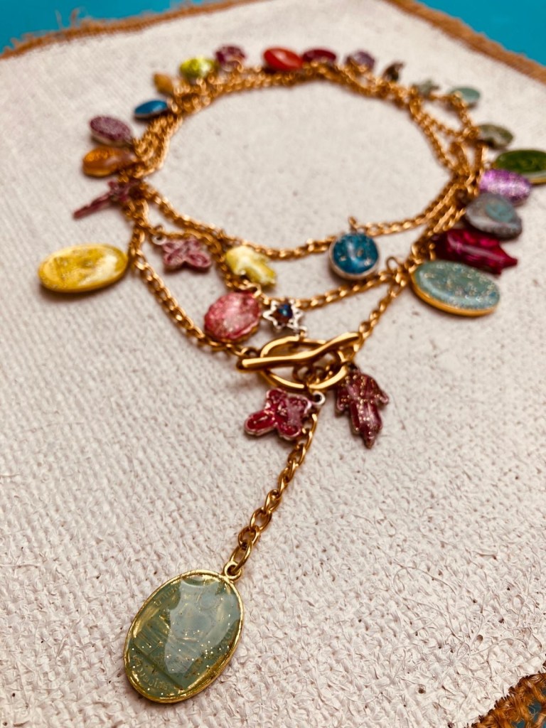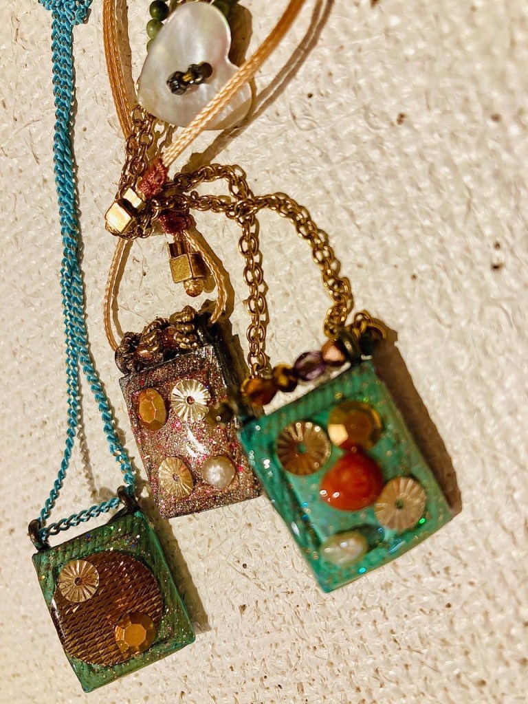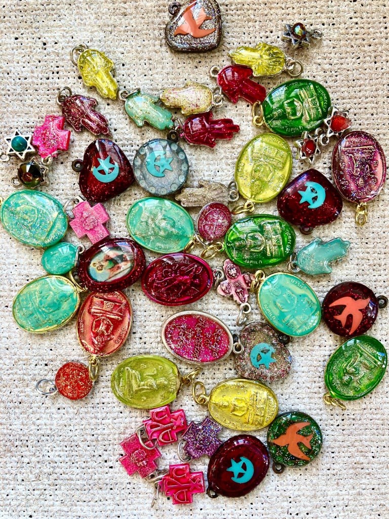 Trouvées, données ou chinées, ces médailles passent par l’atelier d’Isabelle d’Iza.K pour une véritable métamorphose. Elle les ponce, les décape, les nettoie et les repulpe. Sous ses doigts, elles sont pailletées, résinées, caressées et admirées.