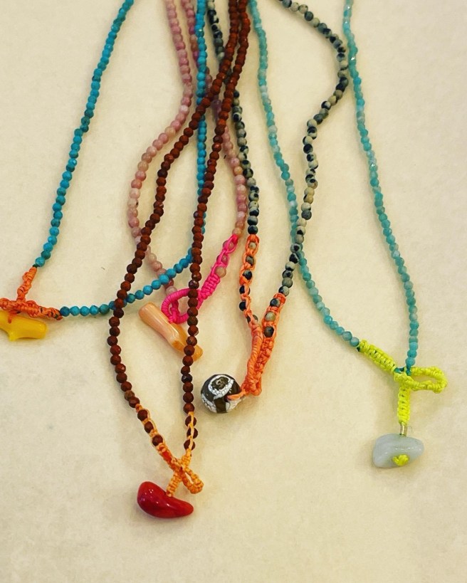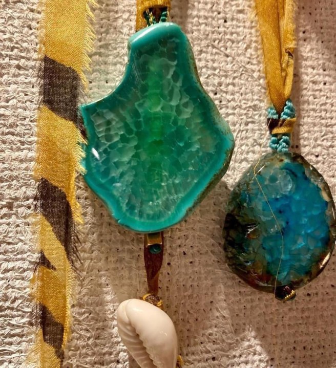 Les perles de verre et les pierres semi précieuses côtoient les médaillons, les rubans de satin, les trophées et les grigris, chinés autour du monde par la créatrice, Isabelle.